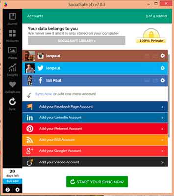 SocialSafe le permite tomar sus datos de hasta cuatro cuentas de redes sociales de forma gratuita. Si necesita copias de respaldo de más cuentas sociales puede pagar siete dólares al año, aunque la mayorÃa de las personas tendrÃa suficiente con la versión gratuita.